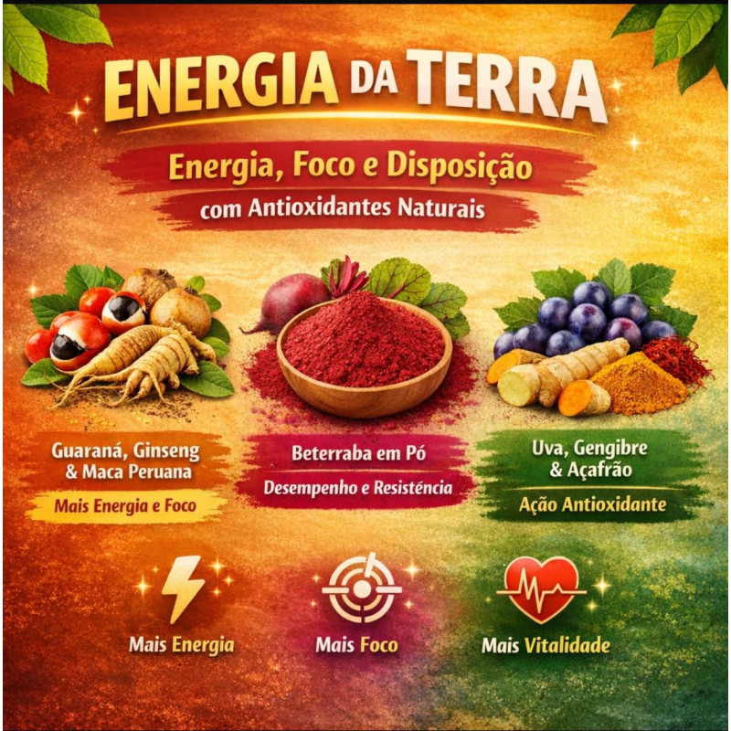 É uma mistura premium natural em pó feita com plantas, raízes e ingredientes funcionais, pensada pra dar energia, foco e vitalidade no dia a dia. Produto alimentar, não é remédio.